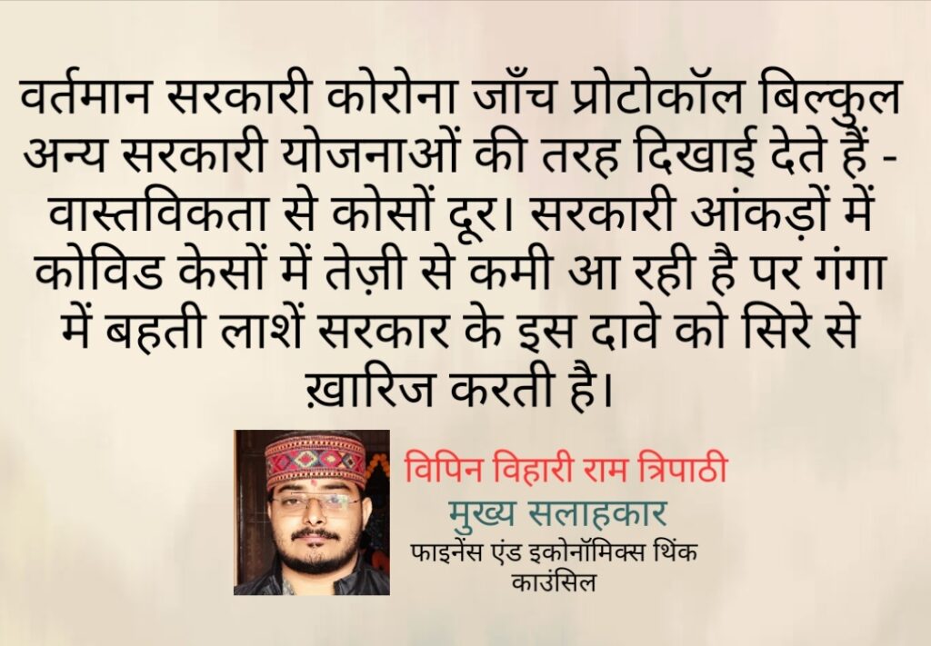 कोविड से चल रही लड़ाई इसलिए भी ख़तरनाक दिखाई पड़ती है क्योंकि आज़ादी के 74 वर्ष बाद भी गांधीजी के सपनों का ग्रामीण भारत बहुत सी मूलभूत सुविधाओं से वंचित है। शायद यहीं कारण है की वर्तमान सरकारी कोरोना जाँच प्रोटोकॉल बिल्कुल अन्य सरकारी योजनाओं की तरह दिखाई देते हैं – वास्तविकता से कोसों दूर। सरकारी आंकड़ों में कोरोना के केसों में तेज़ी से कमी आ रही है पर गंगा में बहती लाशें सरकार के इस दावे को सिरे से ख़ारिज करती है। लाशें झूठ नहीं बोलती।